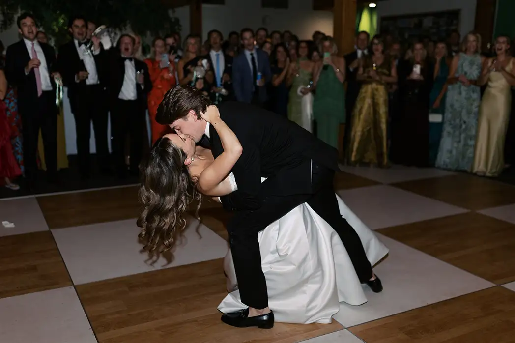 The reception centered around a 16′ x 24′ Birch Checker Dance Floor, which became an instant focal point as guests moved from dinner to dancing. The warm wood tones of the checker pattern complemented the summer ski resort setting while offering a polished, high-impact look that photographs beautifully. This style of dance floor is ideal for couples looking to elevate their reception without overpowering the surrounding environment.