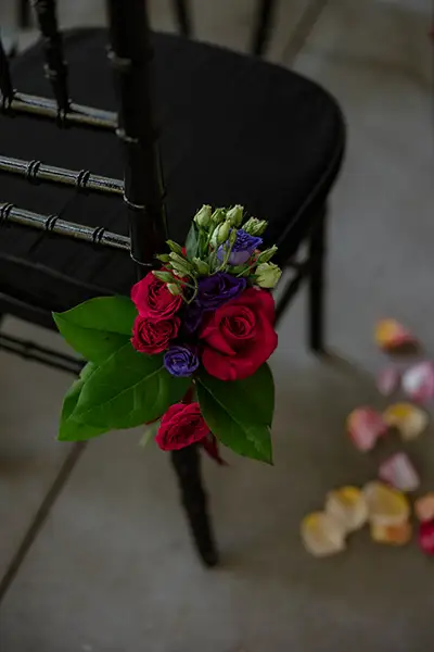 The reception & ceremony space was build around by our Black Chiavari Chair Rentals with matching black pads, creating a sleek and cohesive seating design throughout the room. The classic silhouette of the Chiavari chair added structure and sophistication, while the black finish tied seamlessly into the flatware and overall color palette.