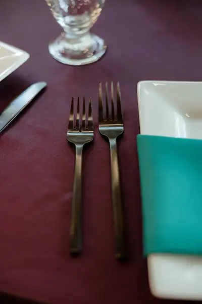 The clean lines of the white square china balanced the depth of the burgundy linen, while matte black flatware reinforced the modern aesthetic. Clear goblets added dimension without distracting from the overall palette.