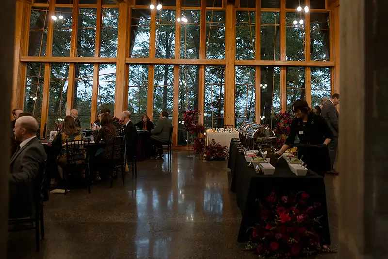 With round guest tables thoughtfully spaced throughout the Tree House, the layout allowed the bold color combination to stand out against the venue’s natural wood paneling and expansive windows. The contrast between the structured tabletop elements and the organic surroundings created a refined yet inviting atmosphere.