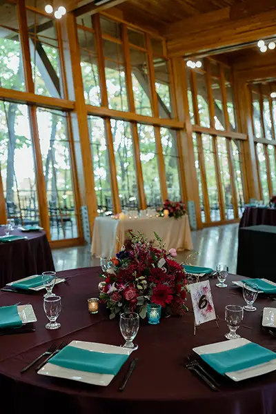 Alpine Events provided rental essentials for a stunning fall wedding reception at the Bissell Tree House at John Ball Zoo. Surrounded by floor-to-ceiling windows and warm wood interiors, this Grand Rapids venue offered a natural backdrop that paired beautifully with a rich, jewel-toned table design.