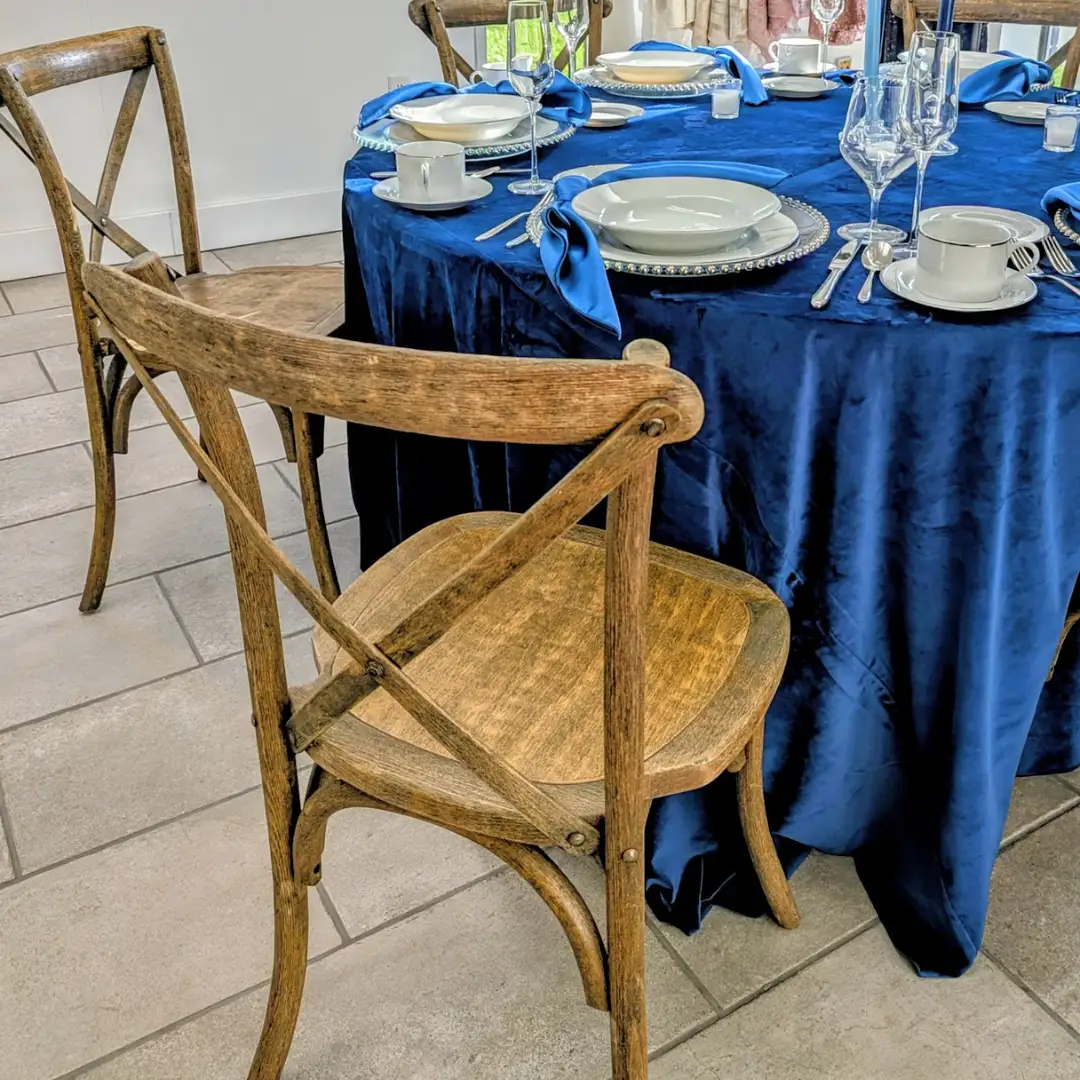 Cool tones and shimmering accents make this tablescape feel straight out of a winter dream. The Velvet Table Linen in Marine and Matte Satin Napkins in Azure bring depth and texture, setting the stage for a luminous celebration. Farm Crossback Chairs lend warmth and a hint of rustic contrast to the icy palette.