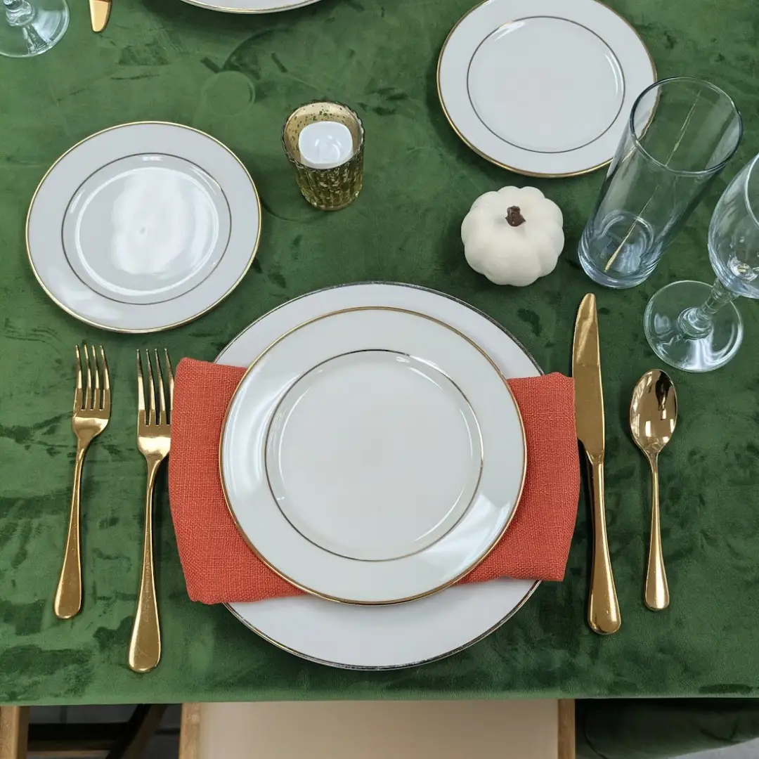 For the tabletop, the Cream & Gold China Collection and Como Gold Flatware create a luxurious contrast, perfectly balanced by the simple elegance of 11.5 oz Tall Collins Glasses and Multi Bar Wine Glasses. Together, these pieces create a look that’s equal parts inviting and refined—perfect for Thanksgiving dinners or December gatherings with a golden glow.