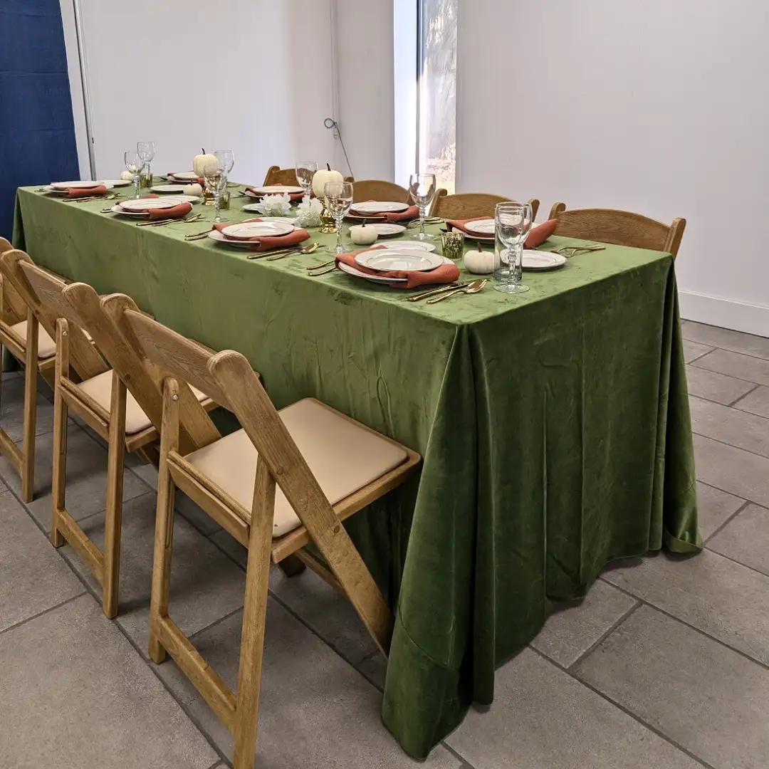 A warm, golden glow defines this cozy autumn-to-holiday transition look. The Velvet Table Linen in Leaf lays the foundation for rich, organic texture, while Panama Napkins in Spice add a soft pop of color reminiscent of cinnamon and cider. The Natural Woodgrain Resin Folding Chairs, a new addition to our inventory, bring rustic refinement to the table.