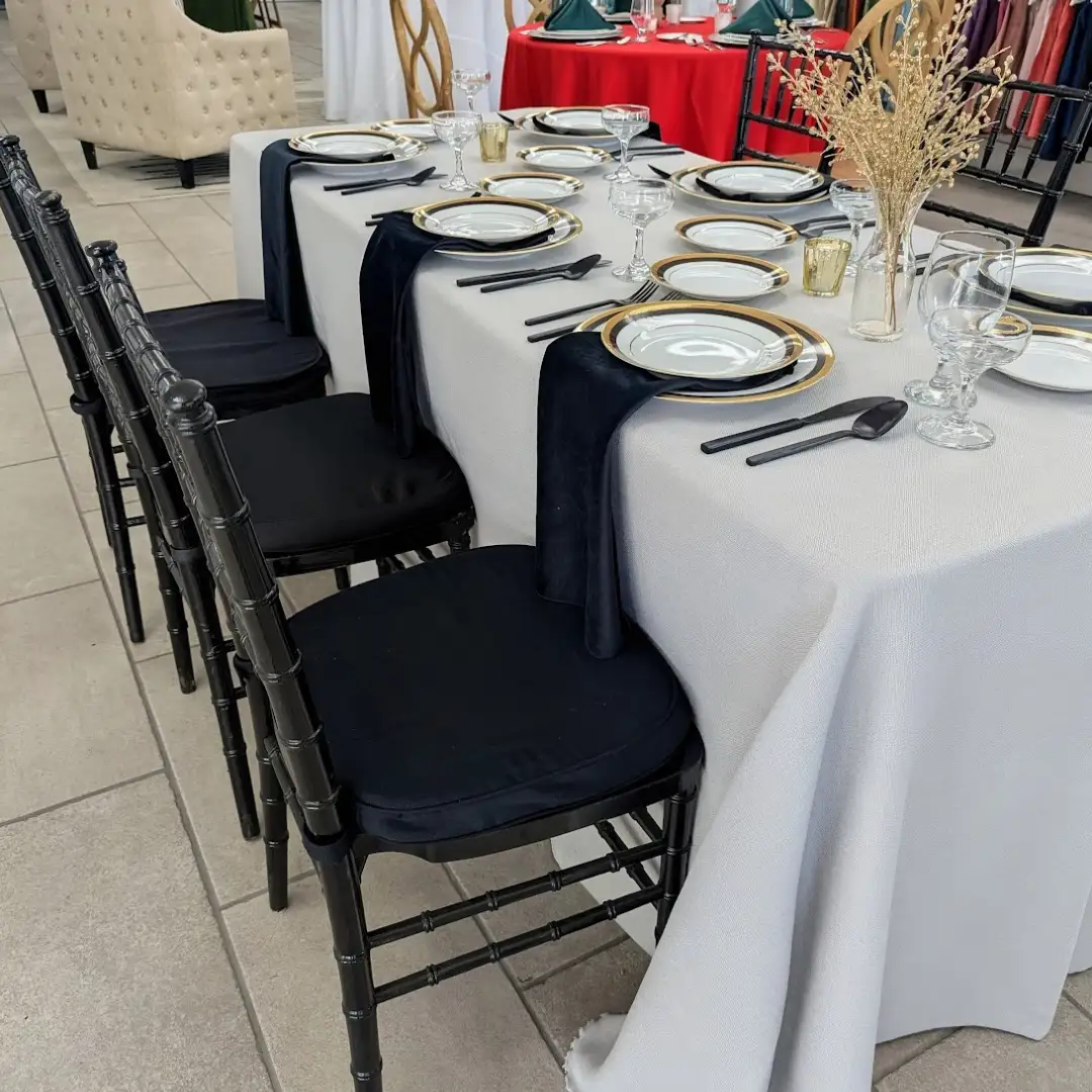 Sophisticated and modern, this look brings a moody twist to holiday entertaining. The Panama Table Linen in Silver pairs effortlessly with Velvet Napkins in Black for a sleek, monochrome foundation. The Black Chiavari Chairs elevate the aesthetic with contemporary flair.