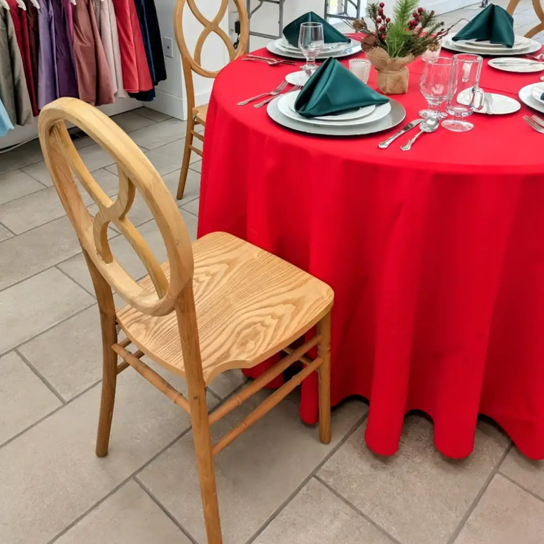 Classic holiday cheer meets timeless style in this festive tablescape. The Poly Table Linen in Cherry Red provides a bold base, paired with Matte Satin Napkins in Hunter for a traditional red-and-green palette. The Chloe Wood Chairs add a rustic warmth that ties the whole setting together.