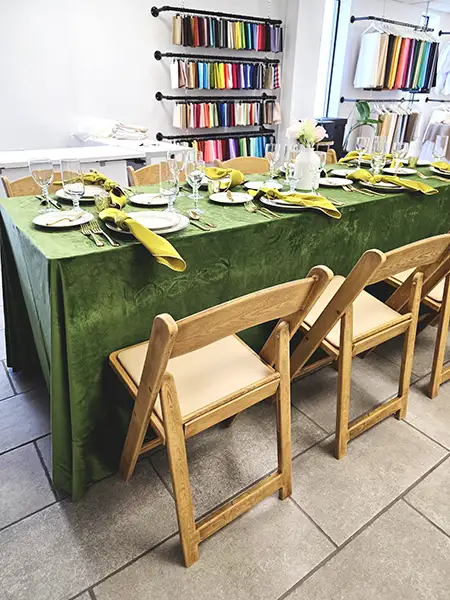 Seeing these combinations in person makes all the difference. Our Grand Rapids, Ann Arbor & Winter Haven showrooms allows clients to explore chair styles, linen textures, tabletop collections, and glassware side by side, helping you confidently build a cohesive event design.