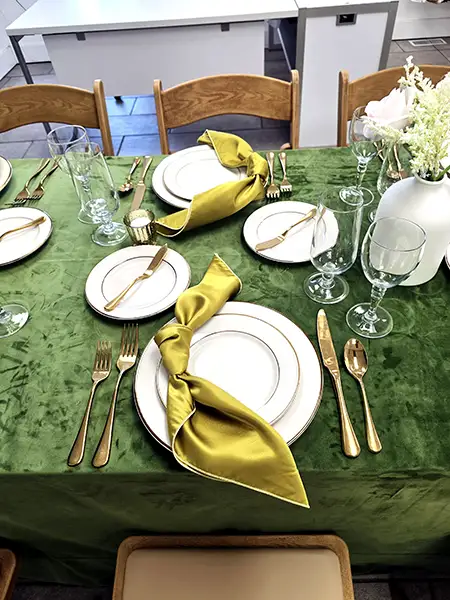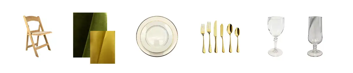 Golden Garden Elegance Table Setting Rentals Golden Garden Elegance Chair Rental Wood Grain ResinThis 8′ banquet table rental tablescape pairs soft green velvet with warm metallic accents for a refined spring look.
